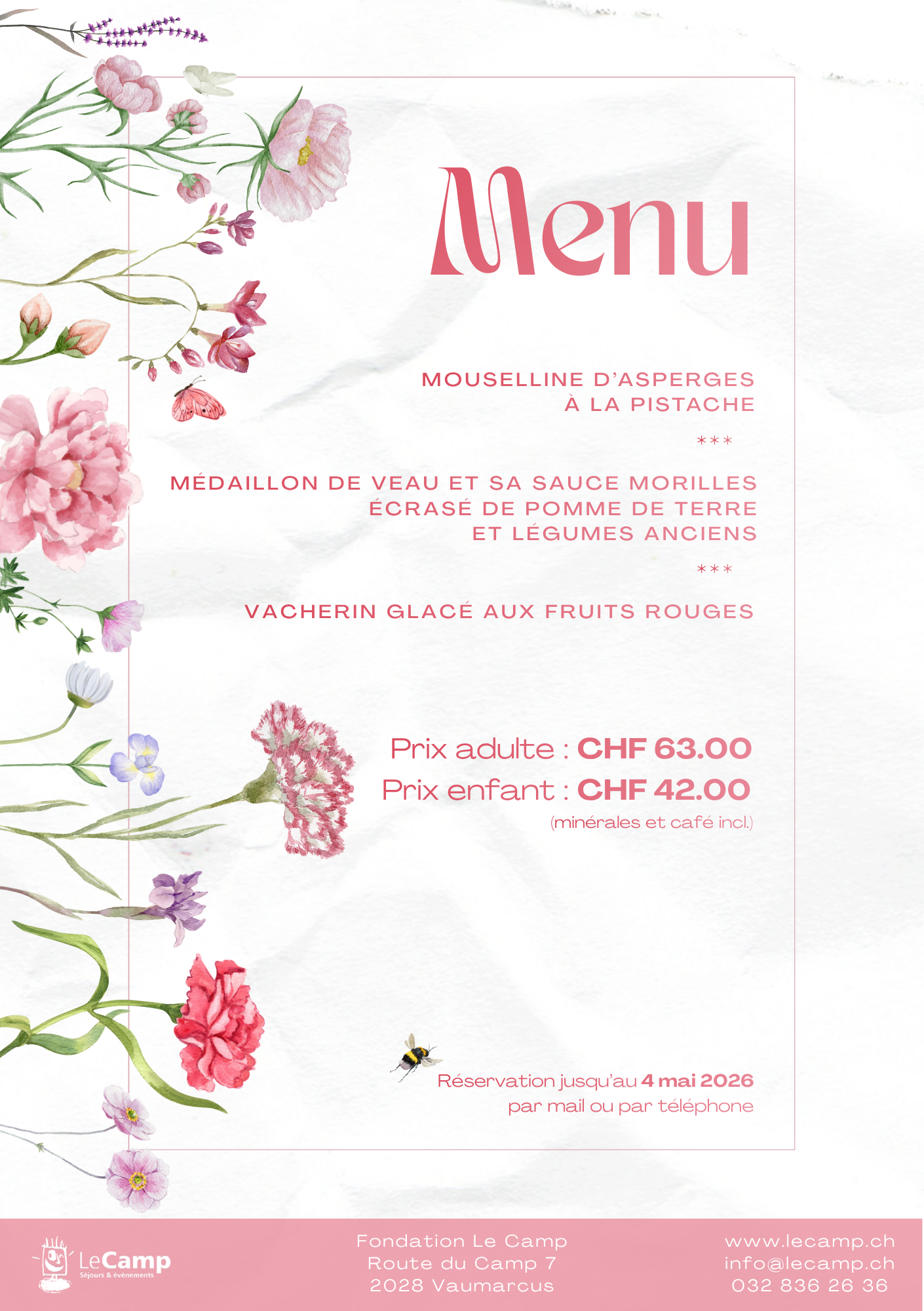 Ce repas est accessible sur réservation uniquement. Les réservations sont ouvertes jusqu’au 4 mai 2026 par téléphone au +41 32 836 26 36 ou par e-mail à
